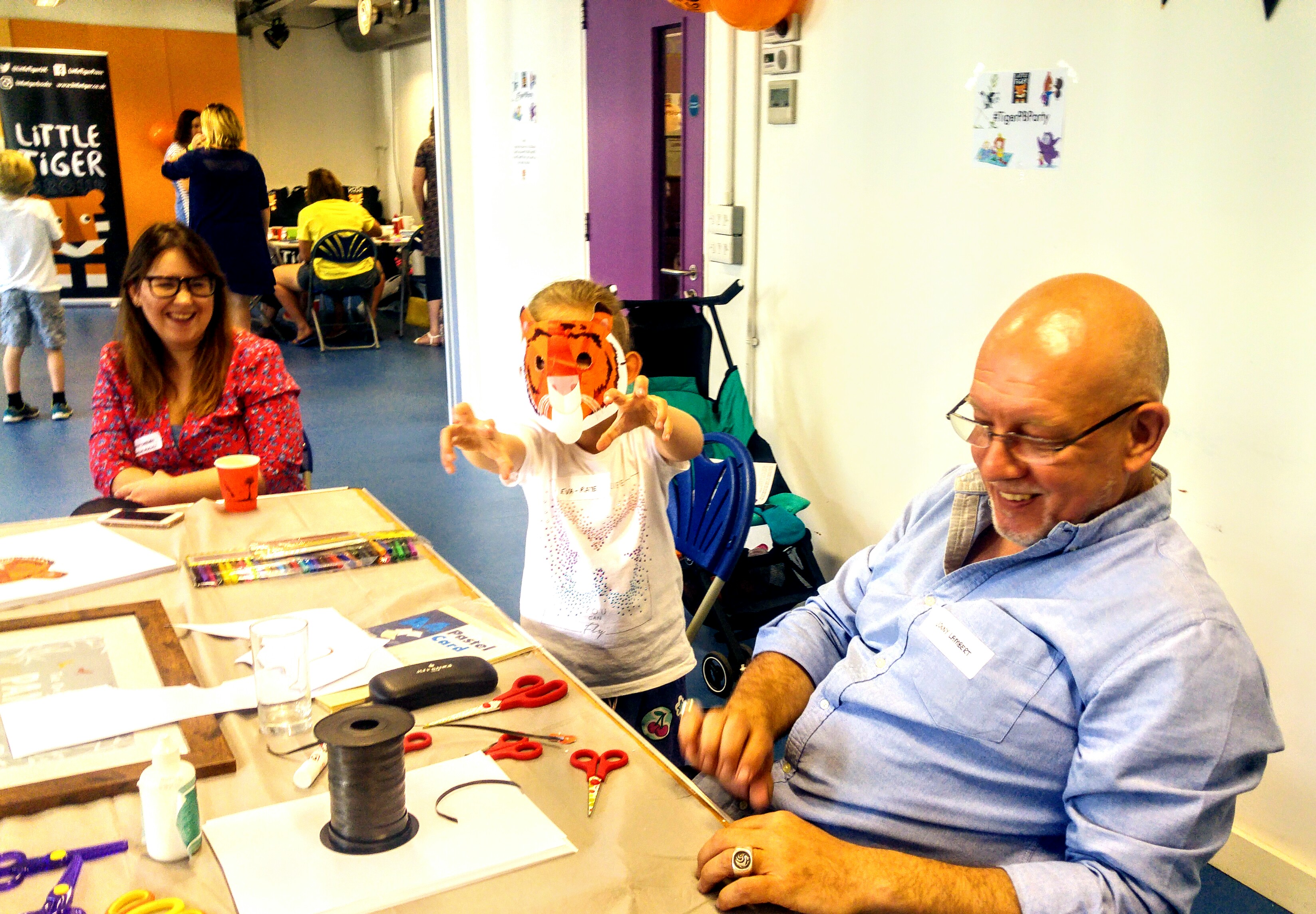 I managed to coax the girls away from the biscuits and we sat with Jonny Lambert, Author & illustrator of An Only Lonely Panda. Jonny had Tiger masks to cut out and wear. He was brilliant with the girls, chatting away with us all and helping Eva whilst I helped Izzy.