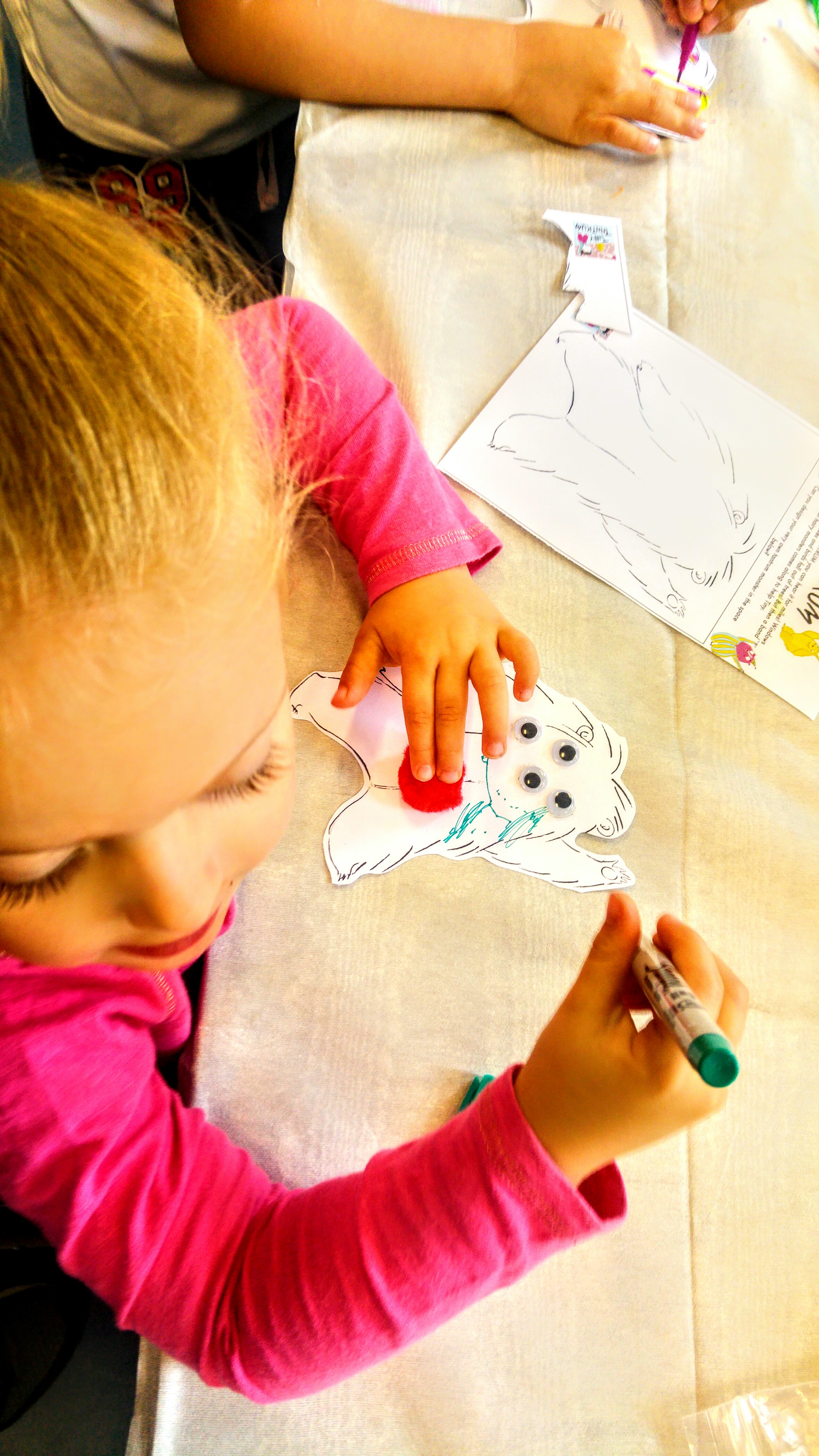 At the next table we met Caroline Crowe, author of Tiny Tantrums. Tiny Tantrum monsters had been cut out ready for decorating. Again the girls happily chatted away whilst making their monsters, adding googly eyes & colouring them.